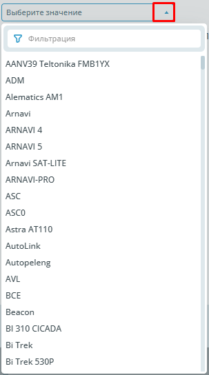 При выборе Типа терминала, нажав на треугольник, открывается список доступных типов