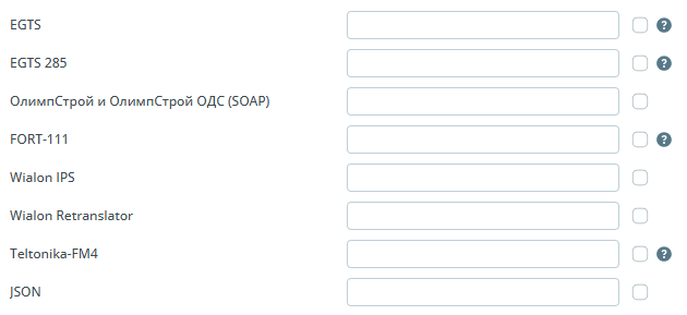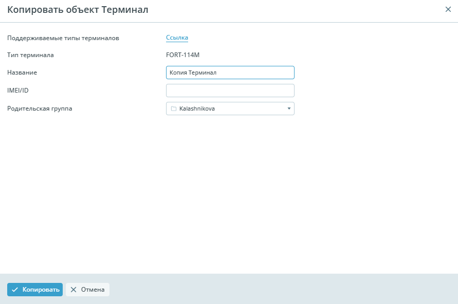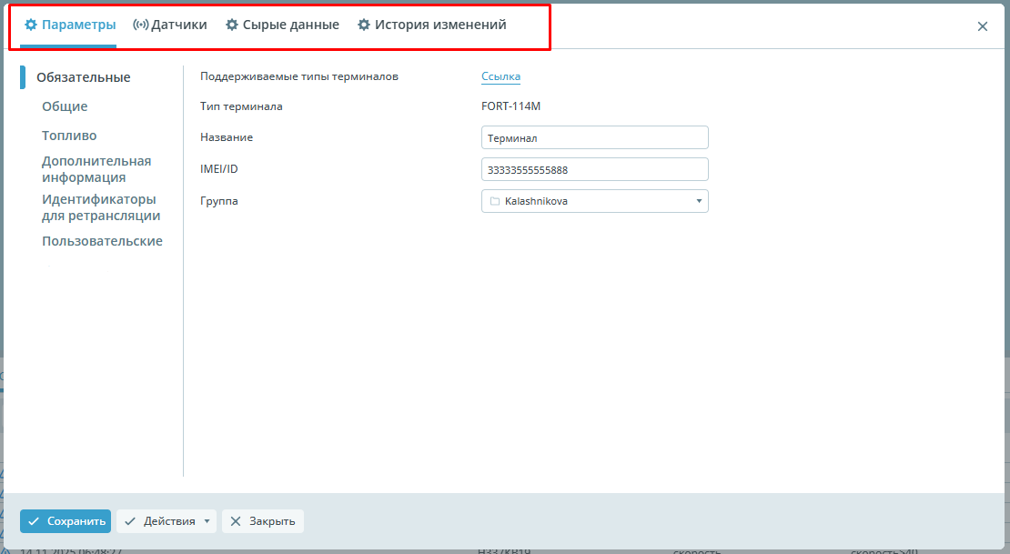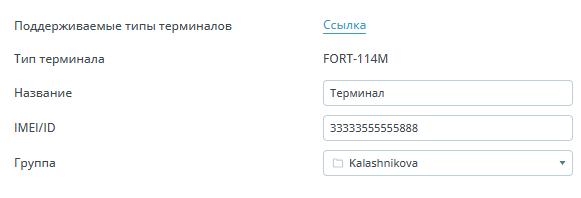 | Обязательные | ![]() | Поддерживаемые типы терминалов - ссылка содержит информацию о поддерживаемых протоколах терминалов и разобранных для них тегах; Тип терминала - модель используемого девайса; Название - имя объекта в системе ПО; IMEI/ID - уникальный идентификатор устройства; Группа - группа, в которой расположен объект |