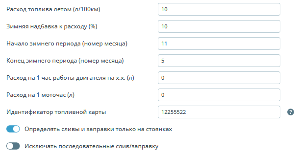 | Топливо | ![]() | Расход топлива летом – норма расхода топлива для автомобиля в летний период; Зимняя надбавка к расходу – процент надбавки к норме расхода автомобиля в зимний период; Расход на 1 час работы двигателя на х.х. – норма расхода топлива для автомобиля на 1 час работы двигателя на холостом ходу; Идентификатор топливной карты – идентификатор по которому будет производится сопоставление по топливной карте и объекта. Существует возможность назначения на каждый объект нескольких топливных карт. Для этого просто необходимо ввести в соответствующее поле параметров объекта несколько идентификаторов, используя в качестве разделителя «;» (без пробелов!); Определять сливы и заправки только на стоянках – если галка поставлена, сливы и заправки будут определяться только в момент отсутствия движения автомобиля; |