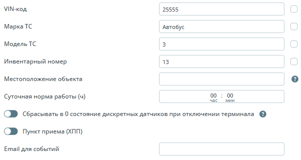 | Дополнительная информация | ![]() | VIN-код – VIN-код транспортного средства. Флажок слева, отвечает за отображение информации под деревом объектов; Инвентарный номер - код объекта в системе учета компании. Флажок слева, отвечает за отображение информации под деревом объектов; Суточная норма работы – количество часов отведенных для работы ТС в сутки, используется в Отчете по спец. технике; Сбрасывать в 0 состояние дискретных датчиков при отключении терминала – при установке данного параметра, все дискретные датчики со значением “1” примут значение “0” после отключения терминала; Пункт приема (ХПП) - используется при выгрузке комбайнов на хлёбоприёмный пункт; Email для событий - отправка на указываемый электронный адрес письма с текстом события. |