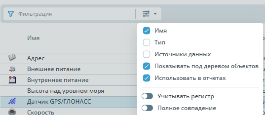 | Фильтрация | ![]() | Настройка фильтрации позволяет выбрать параметры по который можно отфильтровать датчики. По умолчанию отображаются все датчики. |