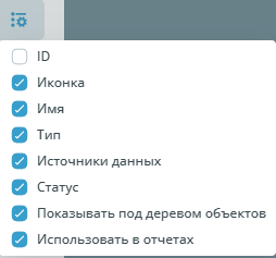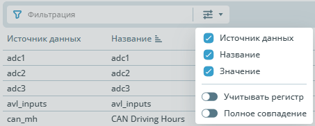 | Выбор столбцов для отображения | ![]() | Позволяет выбрать столбцы для отображения в таблице датчиков. Доступны следующие столбцы: