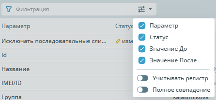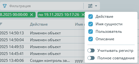 | Фильтрация | ![]() | Настройка фильтрации позволяет выбрать параметры по который можно отфильтровать информацию. По умолчанию отображаются вся информация об изменениях. |