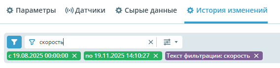 - История изменений - содержит информацию о действиях, производимых при настройке объекта и датчиков.