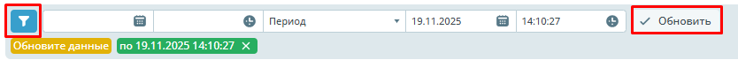 При клике на текст или дату, они удаляются. При удалении даты появляется информация об Обновлении данных. Вы можете задать необходимую дату и время при клике Дополнительная фильтрация. После введения необходимого временного интервала нажать кнопку Обновить.